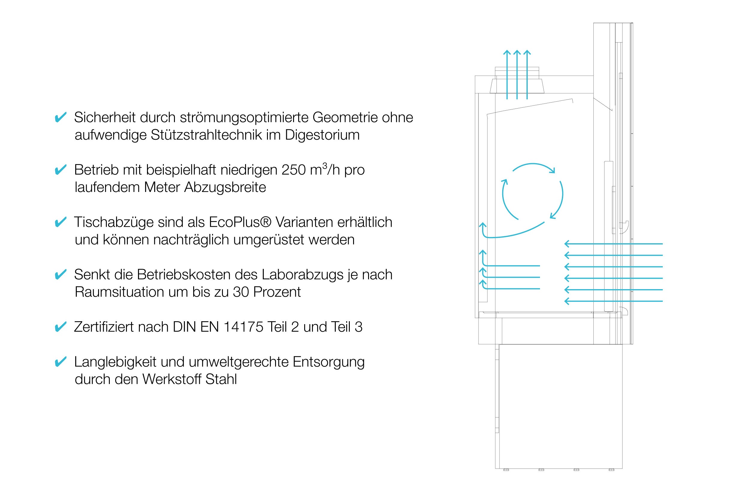 - Strömungstechnisch optimierte Abzugskonstruktionen, die Sicherheit auch bei reduzierten Luftmengen gewährleisten