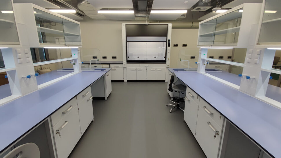 Laboratoria zostały wyposażone w stoły wyspowe z mediami, dygestoria, szafy do przechowywania substancji chemicznych, stoły przyścienne oraz wagowe.